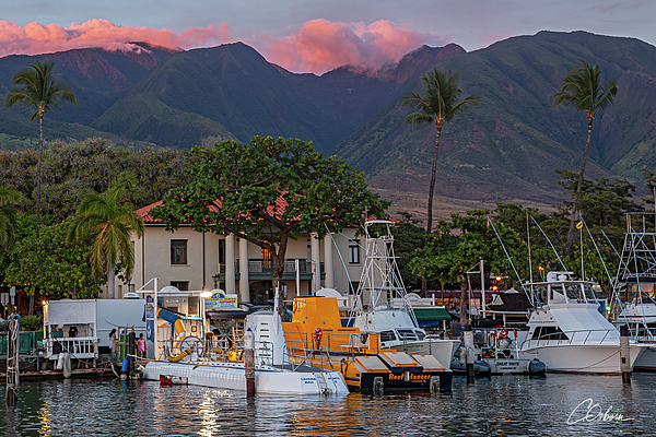 A marina is set against a backdrop of lush green mountains with a few clouds tinged with the colors of sunset. Various boats and yachts are docked along the pier, surrounded by tropical trees and the red-tiled roof Old Lahaina Courthouse.